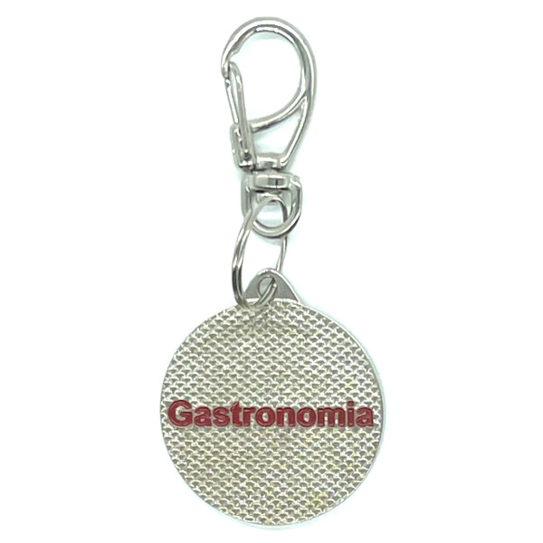 Chaveiro em ZAMAC banhado em níquel e esmaltado em vermelho artesanalmente.